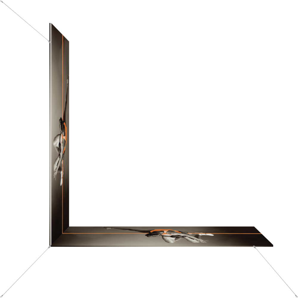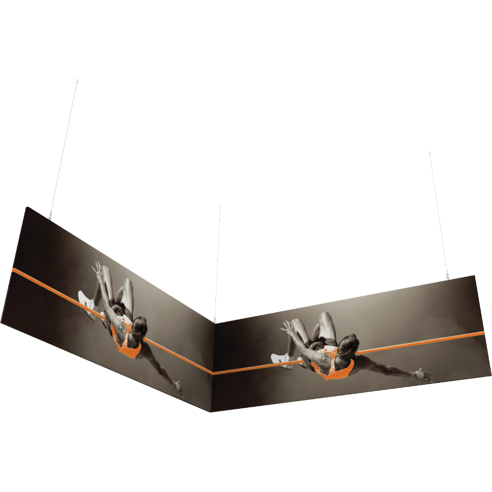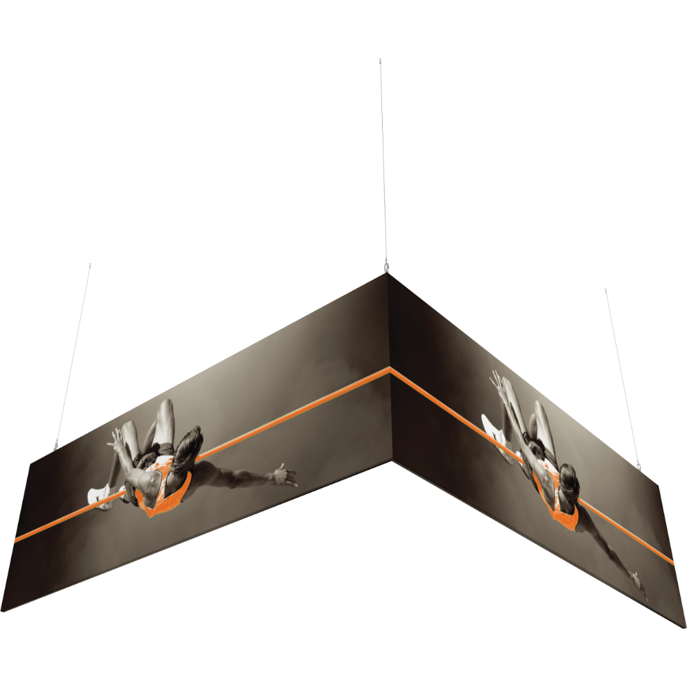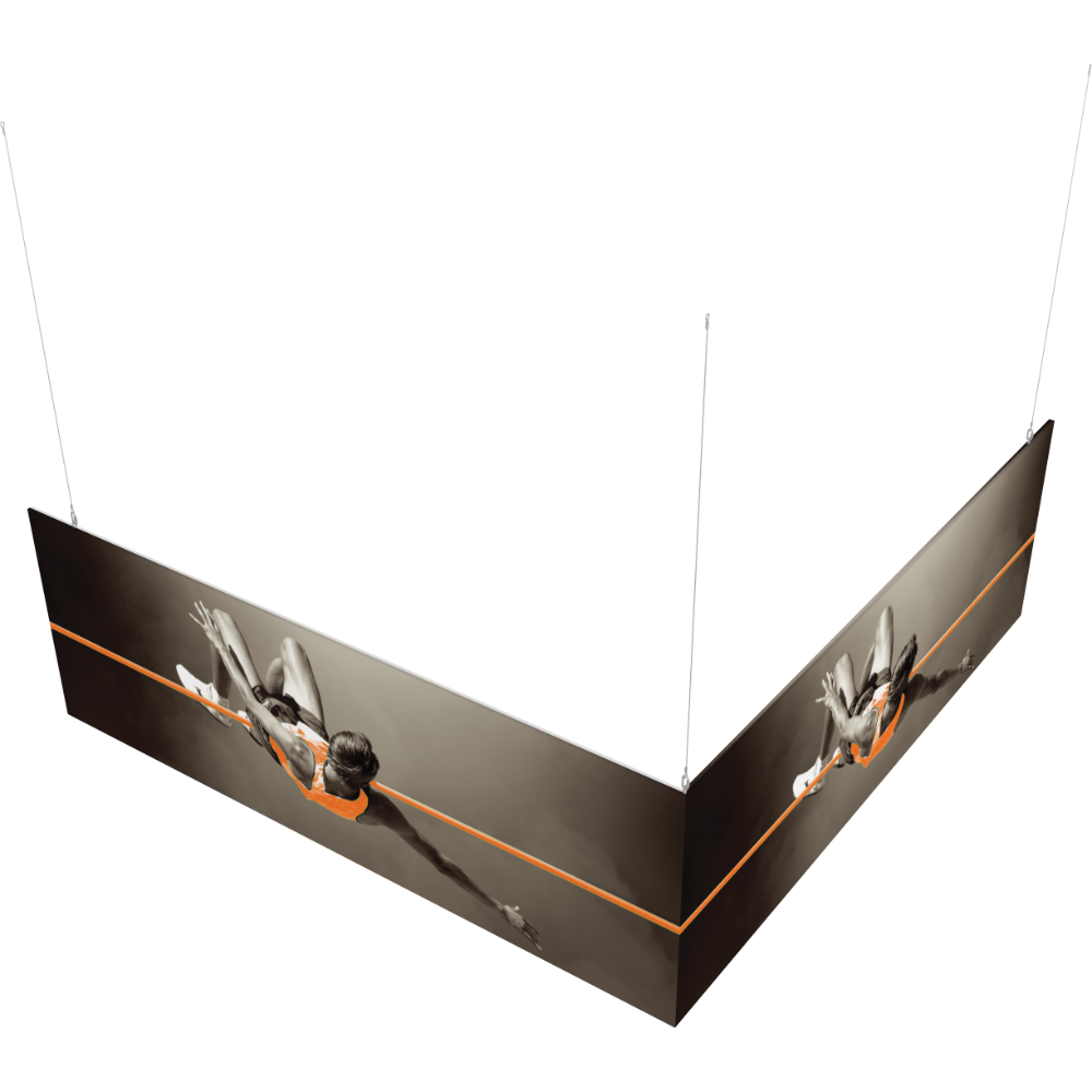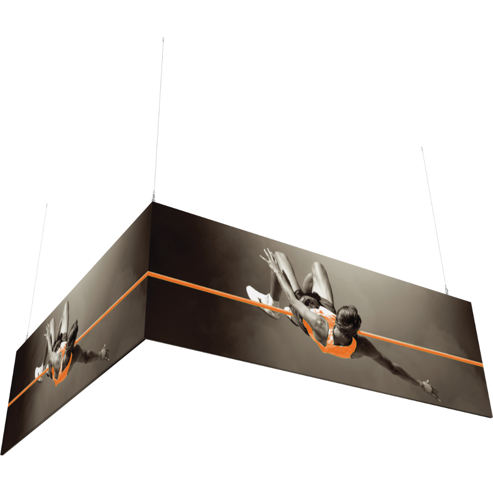 Capture the attention of tradeshow or event attendees with the Formulate® L-Shaped Hanging Structure 1212-04. It easily mounts to any ceiling and is portable so it can be taken to any event. It features powerstretch pillowcase fabric graphics that fit over the lightweight tube structures and displays images clearly in multiple directions.